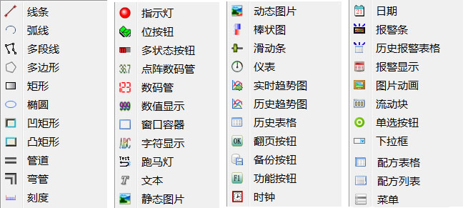 WQT Designer支持多種組態(tài)元件(控件)。