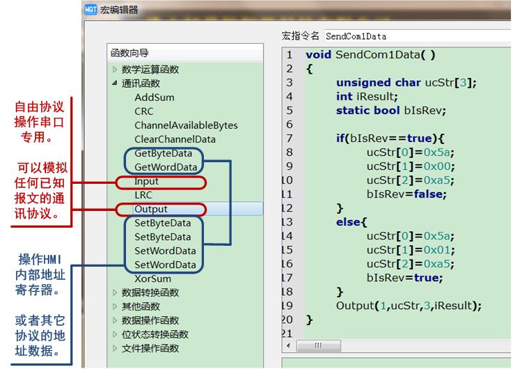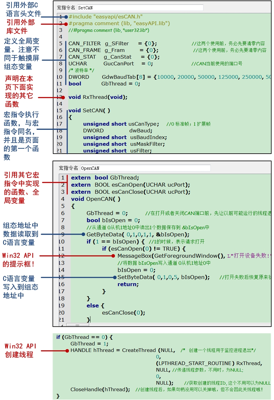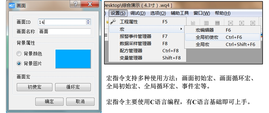 宏指令支持多種使用方法:畫面初始宏、畫面循環(huán)宏、全局初始宏、全局循環(huán)宏、事件宏等。宏指令主要使用C語言編程,有C語言基礎(chǔ)即可上手。
